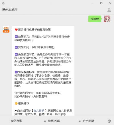 温馨提示:微信搜索公众号【扬州本地宝】,关注后在对话框回复【保教费】获取幼儿园免保教费政策全文,实施时间,哪些儿童可以享受等内容。